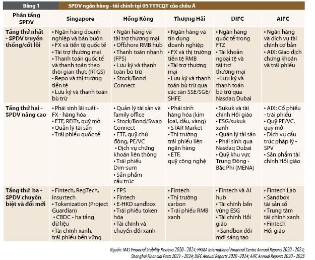 Bên cạnh đó, thực tiễn tại các TTTCQT lớn ở châu Á như Singapore, Hồng Kông, Thượng Hải, DIFC và AIFC cho thấy, hệ sinh thái SPDV thường được tổ chức theo một cấu trúc phân tầng tự nhiên. Ở tầng thấp nhất, các dịch vụ “truyền thống, cốt lõi” bao gồm thanh toán, tín dụng, huy động, ngoại hối, tài trợ thương mại (ngân hàng); cổ phiếu, trái phiếu (thị trường vốn) đóng vai trò nền tảng. Khi thị trường phát triển và cơ sở hạ tầng hiện đại hơn, các dịch vụ “nâng cao” xuất hiện, bao gồm các sản phẩm phái sinh, sản phẩm đầu tư, quản lý tài sản và dịch vụ khác. Tầng cao nhất, được xem là động lực cạnh tranh của các TTTCQT, bao gồm những dịch vụ “chuyên biệt - đổi mới” như Fintech, token hóa (tokenization), tài sản số, tài chính xanh, tín chỉ carbon, công nghệ tuân thủ/giám sát (RegTech/SupTech), dịch vụ dữ liệu tài chính và các cơ chế thử nghiệm có kiểm soát (sandbox).
