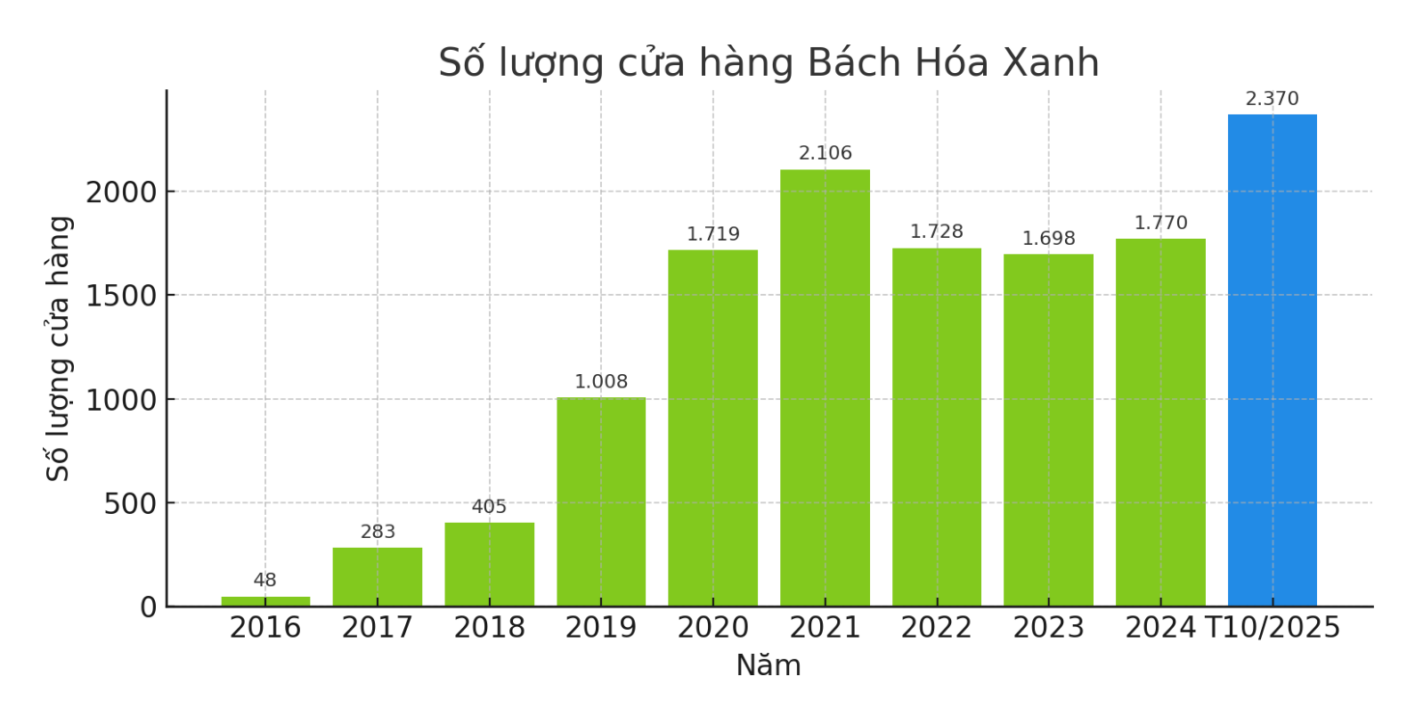 Khi nền tảng tài chính dần ổn định trở lại, MWG bắt đầu nối dài chu kỳ tăng trưởng của Bách Hóa Xanh bằng chiến lược mở rộng mạnh mẽ. Tính đến cuối tháng 10, hệ thống cửa hàng của chuỗi đạt 2.370 cửa hàng, tăng thêm khoảng 600 địa điểm trong năm, trở thành chuỗi có quy mô lớn nhất trong hệ sinh thái MWG, vượt qua cả Điện Máy Xanh.