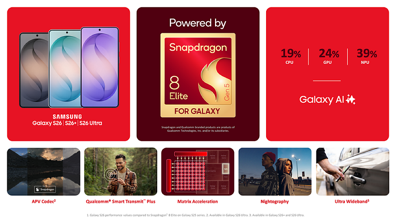 Ông Chris Patrick, Phó Chủ tịch cấp cao kiêm Tổng Giám đốc mảng Điện thoại di động của Qualcomm Technologies, Inc., cho biết: “Trong hơn hai thập kỷ qua, mối quan hệ hợp tác giữa chúng tôi và Samsung đã góp phần định hình xu hướng công nghệ di động. Giờ đây, với dòng Galaxy S26 được trang bị Snapdragon 8 Elite Gen 5 for Galaxy, chúng tôi đang thực hiện bước nhảy vọt mạnh mẽ hướng đến tương lai của những trải nghiệm di động thông minh và hiệu năng cao. Nền tảng này được tùy chỉnh riêng cho dòng Galaxy S26, mang lại hiệu suất và hiệu quả hàng đầu, tái định nghĩa cách người dùng tương tác với thiết bị di động của mình – từ sáng tạo nội dung đến xử lý công việc – với tốc độ, độ chính xác và mức độ cá nhân hóa vượt trội”.