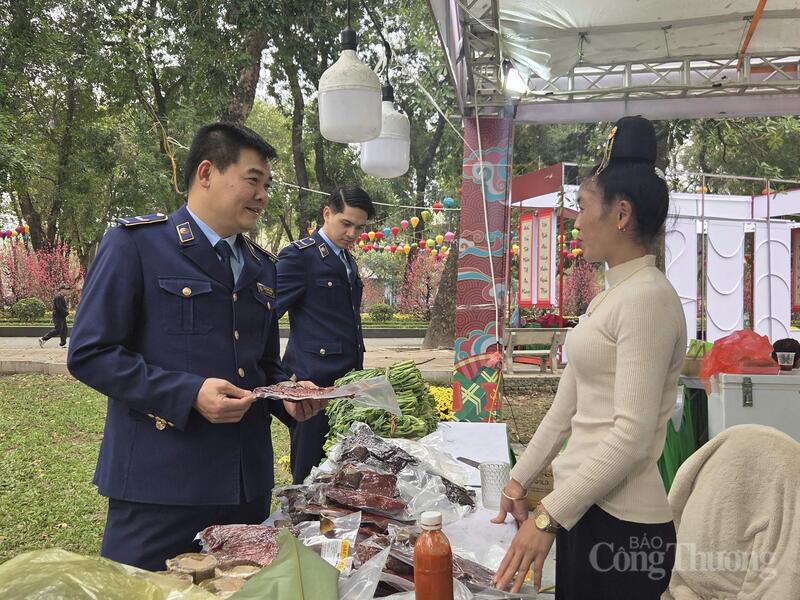 Cán bộ Quản lý thị trường Hà Nội trao đổi, hỏi thăm tình hình kinh doanh, buôn bán của một tiểu thương từ Điện Biên xuống Hà Nội bán hàng tại Không gian Tết Việt 2026 tại Công viên Thống Nhất.