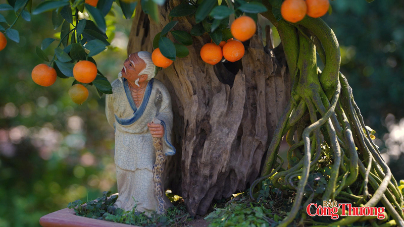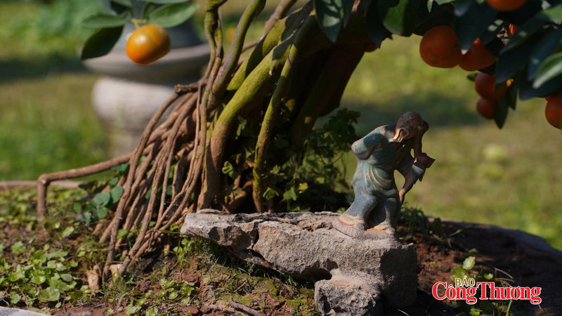 Bên cạnh những thân quất được tạo dáng, người trồng quất còn điểm thêm các bức tượng tạo thêm vẻ sinh động cho cây. Ảnh: Thái Mạnh