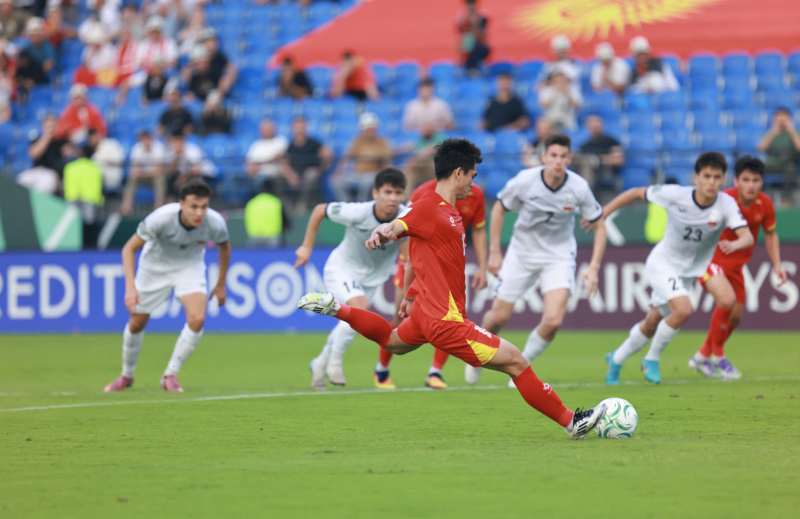 Phút 19, bước ngoặt xuất hiện từ một tình huống như vậy. Sau quả phạt góc, bóng được đưa vào khu vực cấm địa. Lê Phát tranh chấp quyết liệt và buộc Mirzalimi Uulu phạm lỗi. Trọng tài chỉ tay vào chấm 11m. Khuất Văn Khang không mắc sai lầm nào, dứt điểm gọn gàng mở tỷ số 1-0 cho U23 Việt Nam.