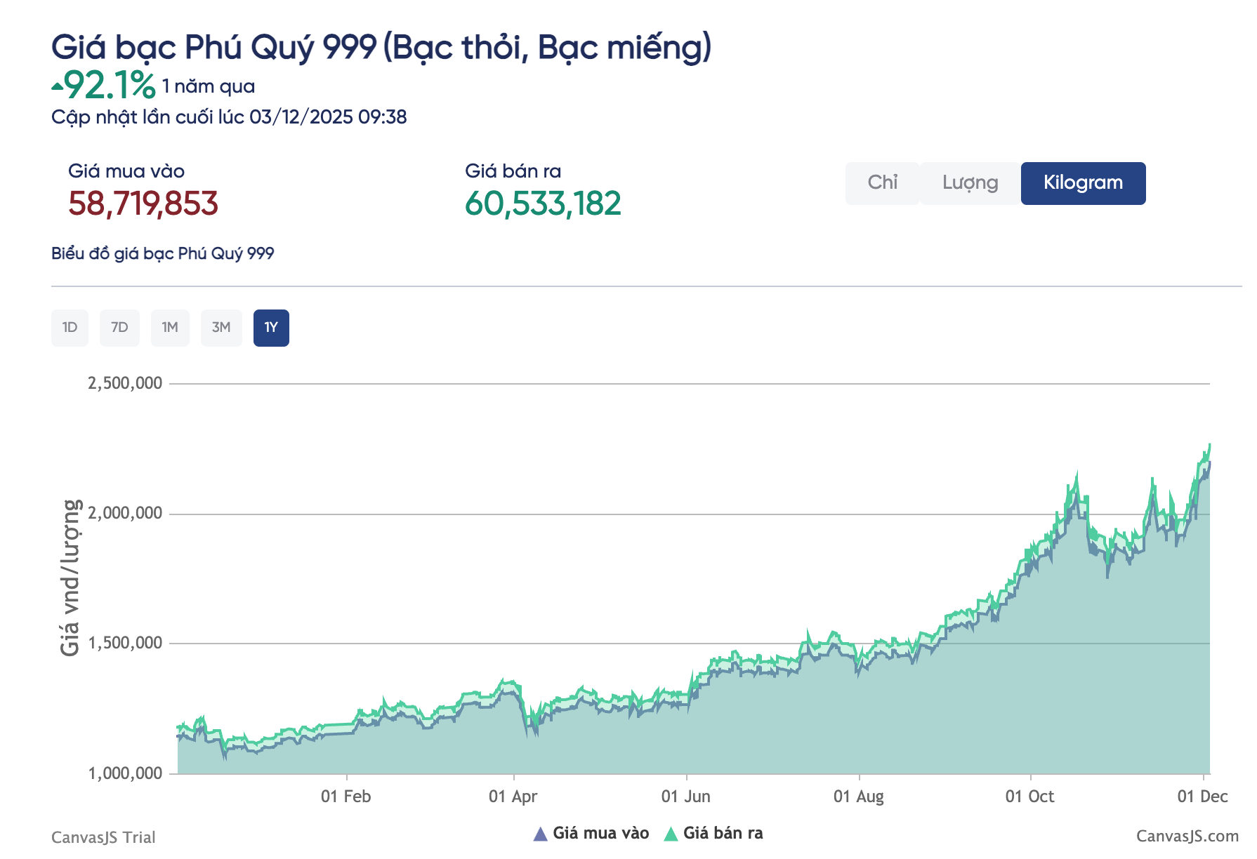 Sáng ngày 3/12, Phú Quý niêm yết giá mua vào 1 lượng bạc 2,2 triệu đồng, bán ra 2,27 triệu đồng; tương đương giá mua vào 1 kg 58,71 triệu đồng và bán ra 60,53 triệu đồng. Đây là lần đầu tiên bạc Phú Quý ghi nhận mốc trên 60 triệu đồng/kg.