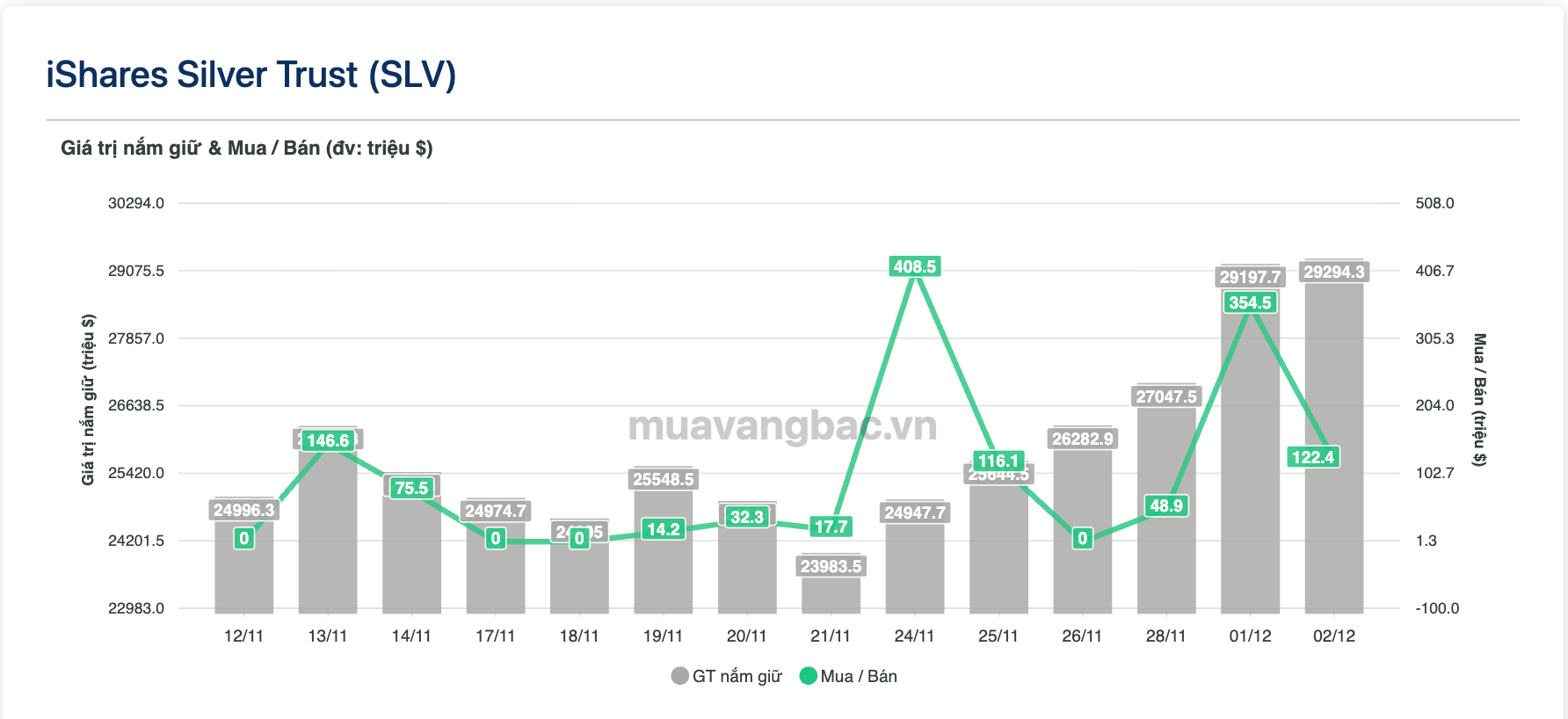 Trong khi đó, Sprott Physical Silver Trust USD (PSLV) do Sprott Asset Management LP quản lý, đang nắm gần 205 triệu ounce bạc (~6,4 nghìn tấn), tương đương quy mô tài sản gần 12 tỷ USD. Từ đầu năm, quỹ đã mua thêm gần 25 triệu ounce bạc (750 tấn).