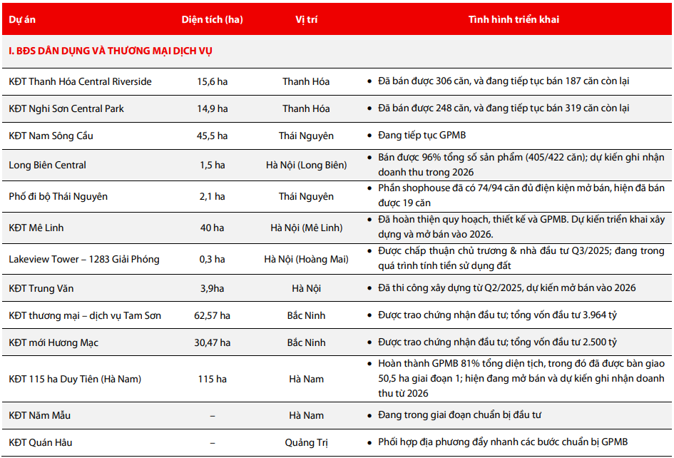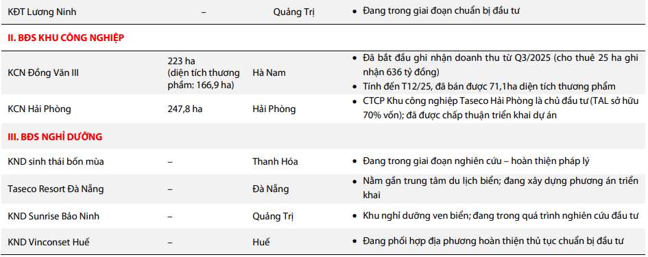 Tính đến tháng 12/2025, TAL sở hữu danh mục quỹ đất 996 ha phân bổ tại ba nhóm chính: bất động sản nhà ở – thương mại dịch vụ (450 ha), khu công nghiệp (471 ha) và nghỉ dưỡng (75 ha). Một số dự án đang bán hàng hoặc đã đạt tỷ lệ tiêu thụ lớn gồm Thanh Hóa Central Riverside, Nghi Sơn Central Park và Long Biên Central. Khu đô thị 115 ha tại Hà Nam đã hoàn thành 81% giải phóng mặt bằng và bắt đầu mở bán giai đoạn 1.