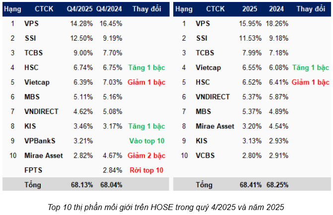 (Banker.vn) CTCP Chứng khoán VPBank - VPBankS (mã chứng khoán VPX) vừa công bố báo cáo tài chính quý IV/2025, cho thấy một sự chuyển dịch mạnh mẽ về cấu trúc tài chính. Không chỉ ghi nhận lợi nhuận bùng nổ, VPBankS lần đầu tiên được góp mặt vào top 10 thị phần môi giới chứng khoán trên HOSE.