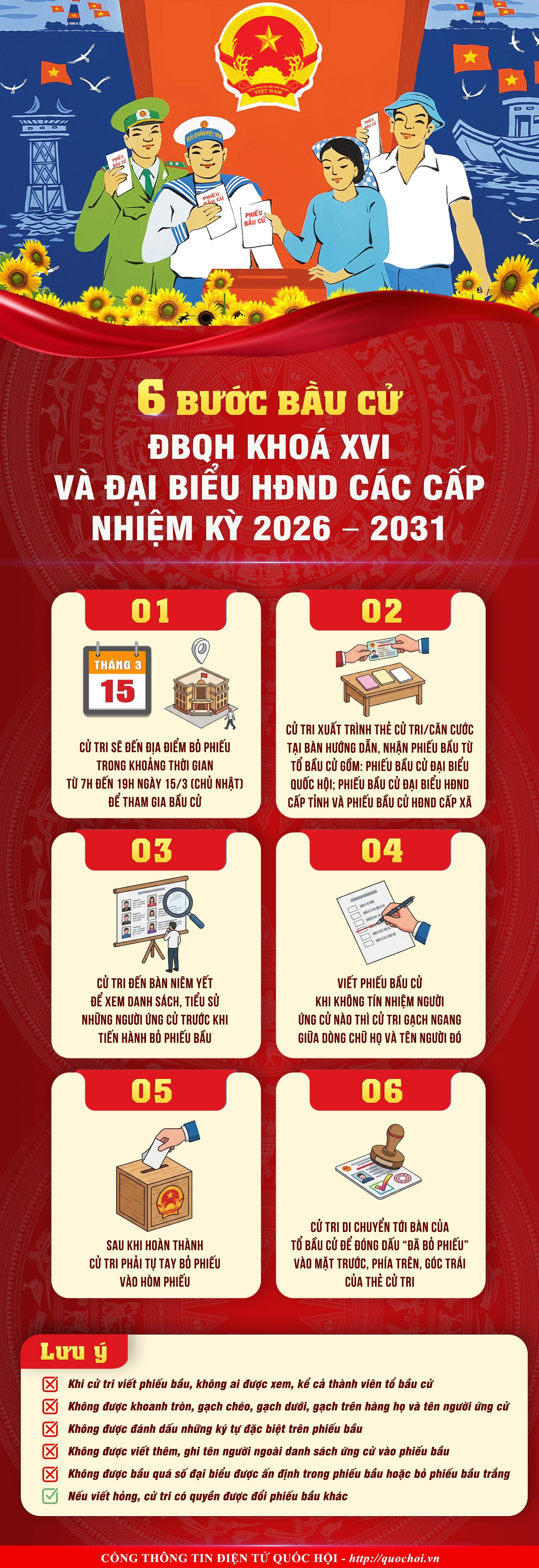Quy trình 6 bước bầu cử ĐBQH khoá XVI và Đại biểu HĐND các cấp nhiệm kỳ 2026 - 2031