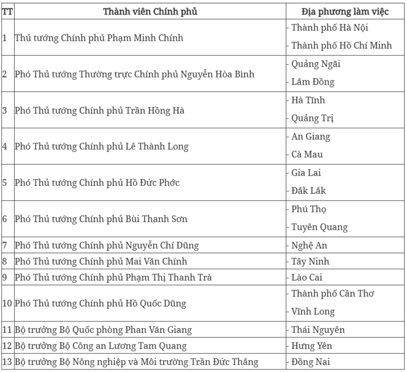 Thủ tướng Chính phủ phân công các Thành viên Chính phủ chủ trì làm việc với các địa phương như sau: