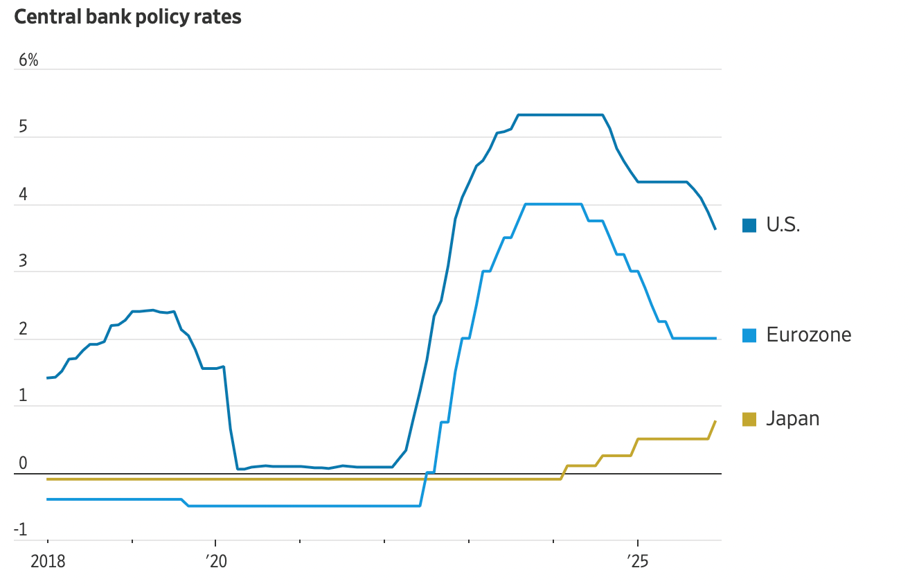 Tại châu Á: Ngân hàng Trung ương Nhật Bản (BOJ) đi ngược lại xu hướng toàn cầu và tăng lãi suất thêm 0,25 điểm phần trăm, tương đương 25 điểm cơ bản. Điều này đưa lãi suất chính sách của BOJ lên 0,75%, mức cao nhất trong 30 năm. Đồng Yên suy yếu và lợi suất trái phiếu tăng.