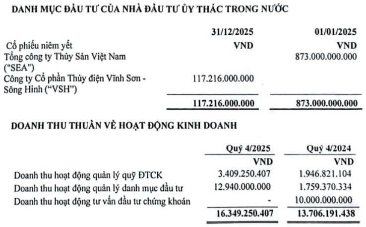 Cụ thể, công ty ghi nhận khoản ủy thác hơn 117 tỷ đồng vào cổ phiếu của Công ty CP Thủy điện Vĩnh Sơn Sông Hinh (VSH). Trước đó, một khoản ủy thác lên tới 873 tỷ đồng tại cổ phiếu SEA (Seaprodex) cũng từng xuất hiện nhưng hiện không còn được ghi nhận. Quy mô các khoản ủy thác này vượt đáng kể so với vốn chủ sở hữu của chính Red Capital, qua đó phản ánh vai trò trung gian quản lý dòng tiền thay vì trực tiếp đầu tư bằng nguồn lực nội tại.