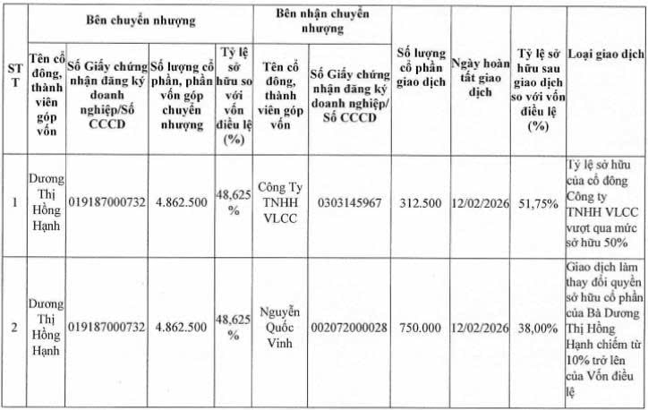 Cụ thể, hơn 312.000 cổ phần được chuyển cho Công ty TNHH VLCC, qua đó nâng tỷ lệ sở hữu của tổ chức này lên 51,75% và trở thành công ty mẹ của Red Capital. Cùng ngày 12/2/2026, ông Nguyễn Quốc Vinh cũng nhận chuyển nhượng 750.000 cổ phần, nâng tỷ lệ sở hữu lên 38%.