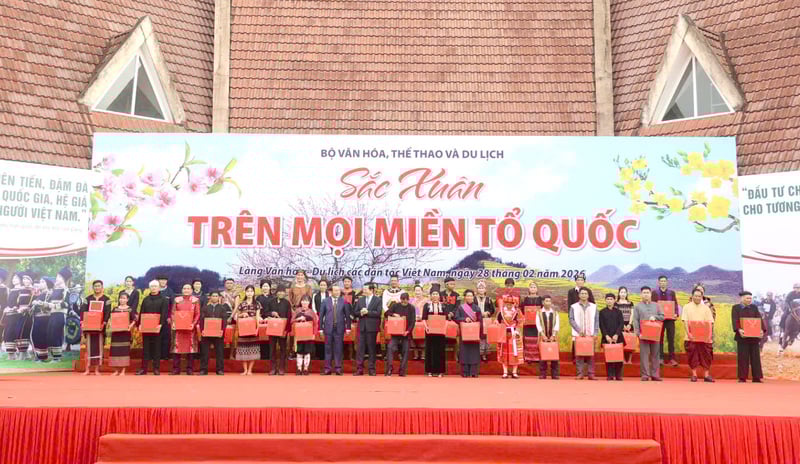Phó Thủ tướng Mai Văn Chính và Bộ trưởng Bộ Văn hóa, Thể thao và Du lịch Nguyễn Văn Hùng tặng quà cho đồng bào các dân tộc tại sự kiện.