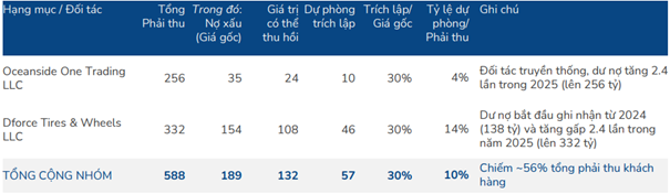 Ngoài ra, Dforce Tires & Wheels LLC (khách hàng bắt đầu phát sinh dư nợ từ năm 2024) ghi nhận dư nợ phải thu lên tới 332 tỷ đồng trong năm 2025. Khoảng 154 tỷ đồng trong số này đã được phân loại là nợ xấu, và doanh nghiệp đã thực hiện trích lập dự phòng khoảng 46 tỷ đồng, tương ứng tỷ lệ 30% giá trị nợ xấu.