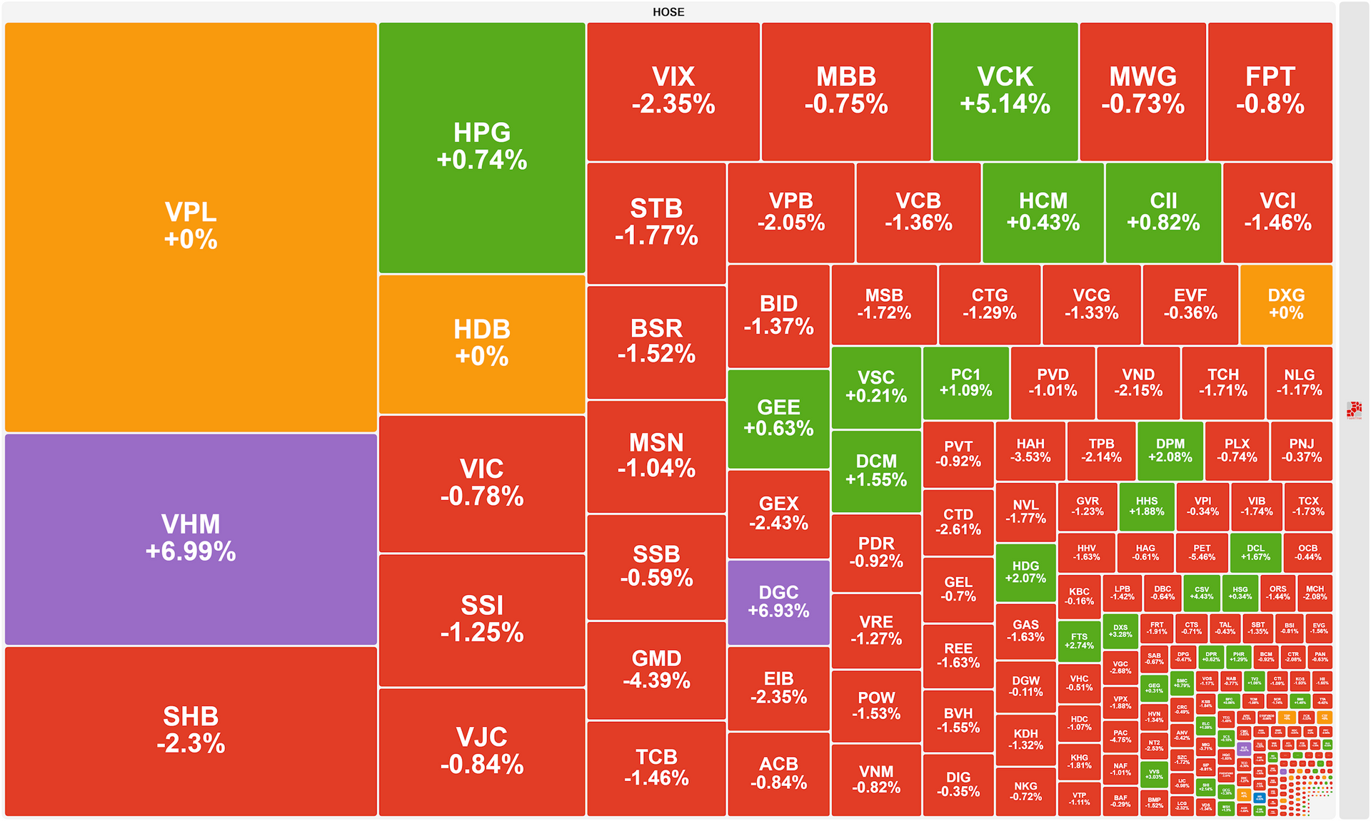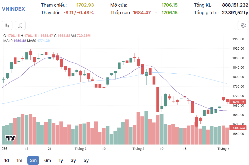 Kết thúc phiên giao dịch hôm nay, VN-Index giảm 8,11 điểm (-0,48%) xuống 1.694,82 điểm, với 244 mã giảm, gấp 3 lần số mã tăng (82 mã). Tổng khối lượng giao dịch đạt 888,2 triệu đơn vị, giá trị đạt 27.391 tỷ đồng, giảm 5,8% về khối lượng và 6,3% về giá trị so với phiên hôm qua. Trong đó, giao dịch thỏa thuận đóng góp 157,8 triệu đơn vị, giá trị 6.788,6 tỷ đồng.