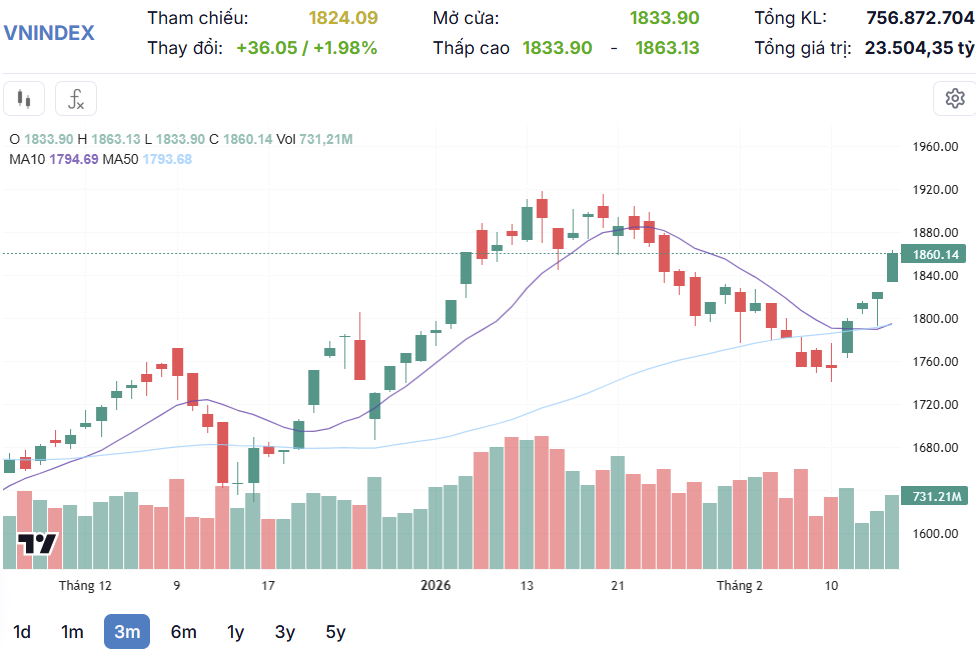 Kết thúc phiên giao dịch, sàn HOSE có 280 mã tăng, gấp gần 4 lần số mã giảm (73 mã), VN-Index tăng 36,05 điểm (+1,98%), lên 1.860,14 điểm. Tổng khối lượng giao dịch đạt 756,9 triệu đơn vị, giá trị gần đạt 23.504 tỷ đồng, tăng 24,1% về khối lượng và 15,8% về giá trị so với phiên giao dịch cuối cùng trước kỳ nghỉ Tết Nguyên đán (ngày 13/2). Giao dịch thỏa thuận đóng góp hơn 25,6 triệu đơn vị, giá trị đạt 849,9 tỷ đồng.