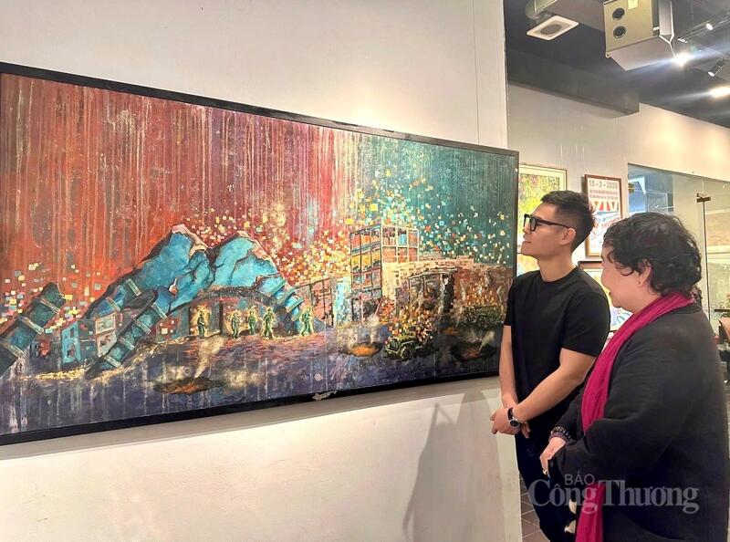 Họa sĩ Chu Nhật Quang và nhà phê bình mỹ thuật Mai Thị Ngọc Oanh, Phó Chủ tịch Thường trực Hội Mỹ thuật Việt Nam, trao đổi bên tác phẩm của Chu Nhật Quang tại triển lãm "Mừng Đảng Mừng Xuân" 2026.
