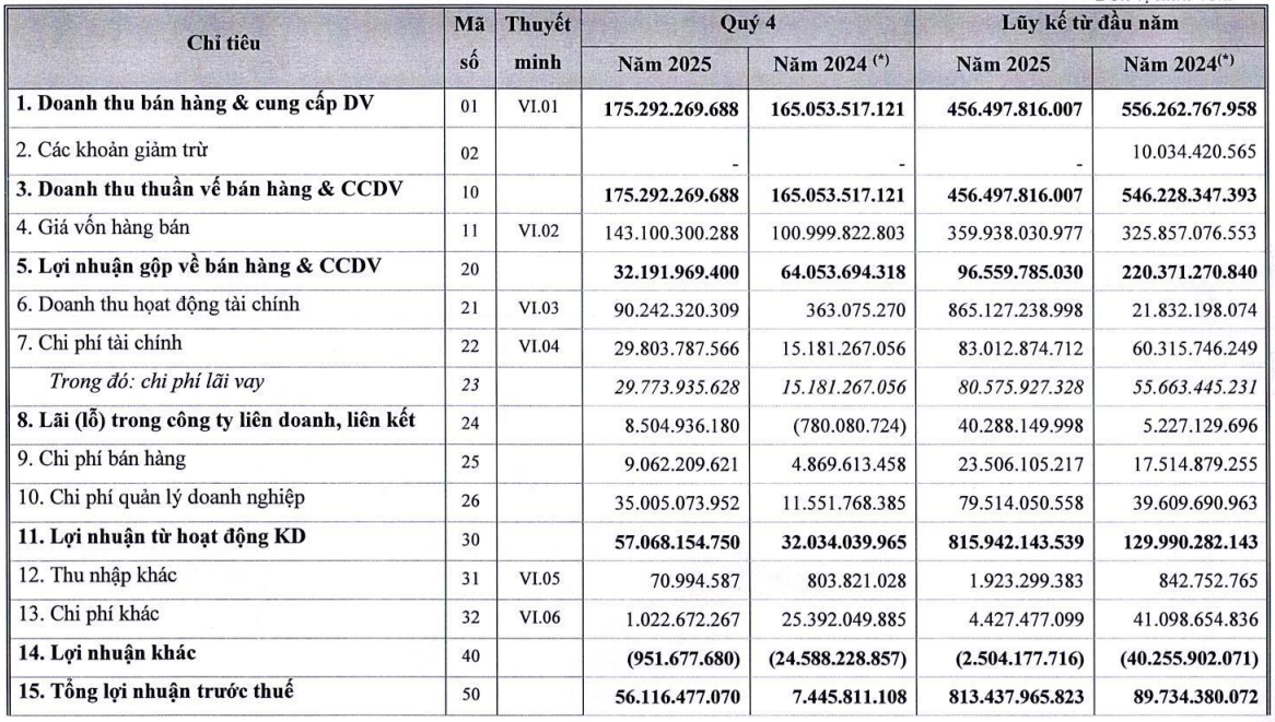 Ở chiều ngược lại, các chỉ tiêu kinh doanh cốt lõi trong năm 2025 vẫn khá khiêm tốn. Doanh thu thuần cả năm đạt 456 tỷ đồng, giảm so với năm trước, trong đó doanh thu từ bán bất động sản sụt giảm mạnh. Biên lợi nhuận gộp mảng bất động sản cũng thu hẹp đáng kể. Chi phí bán hàng và quản lý doanh nghiệp gia tăng cũng tiếp tục tạo áp lực lên hiệu quả hoạt động.