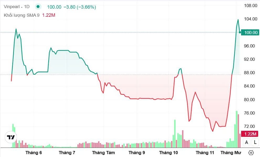 Đóng cửa phiên giao dịch ngày 3/12, cổ phiếu VPL của Công ty CP Vinpearl (sàn HOSE) ghi nhận nhịp điều chỉnh 3,66%, đưa thị giá xuống 100.000 đồng/cp sau chuỗi 8 phiên tăng liên tiếp trước đó. Trước đó, thị giá mã này đã tăng từ vùng 72.000 đồng lên ngưỡng ba chữ số, tương đương mức tăng gần 40% chỉ trong hơn một tuần giao dịch.