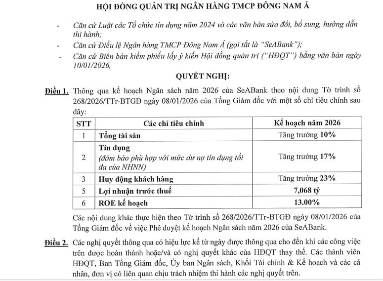 Theo nghị quyết đã được thông qua, SeABank đặt mục tiêu lợi nhuận trước thuế năm 2026 đạt 7.068 tỷ đồng. Cùng với đó, tổng tài sản dự kiến tăng khoảng 10%, dư nợ tín dụng tăng 17% và huy động vốn từ khách hàng tăng trên 20%. Đây là những chỉ tiêu thể hiện định hướng mở rộng quy mô tiếp tục được duy trì, song vẫn nằm trong biên độ được xem là phù hợp với mặt bằng chung của hệ thống ngân hàng, nhất là trong bối cảnh chính sách tiền tệ được điều hành theo hướng thận trọng, ưu tiên ổn định vĩ mô và kiểm soát rủi ro.