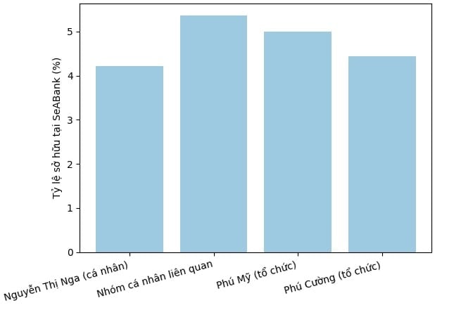 Tính gộp sở hữu của bốn cá nhân trong gia đình gồm bà Nguyễn Thị Nga, ông Lê Hữu Báu, ông Lê Tuấn Anh và bà Lê Thu Thủy, tổng tỷ lệ nắm giữ tại SeABank trước các giao dịch dự kiến vào khoảng 9,59% vốn điều lệ. Trong đó, bà Nga chiếm khoảng 4,22%; bà Lê Thu Thủy khoảng 2,31%; ông Lê Hữu Báu khoảng 1,78% và ông Lê Tuấn Anh khoảng 1,28%.