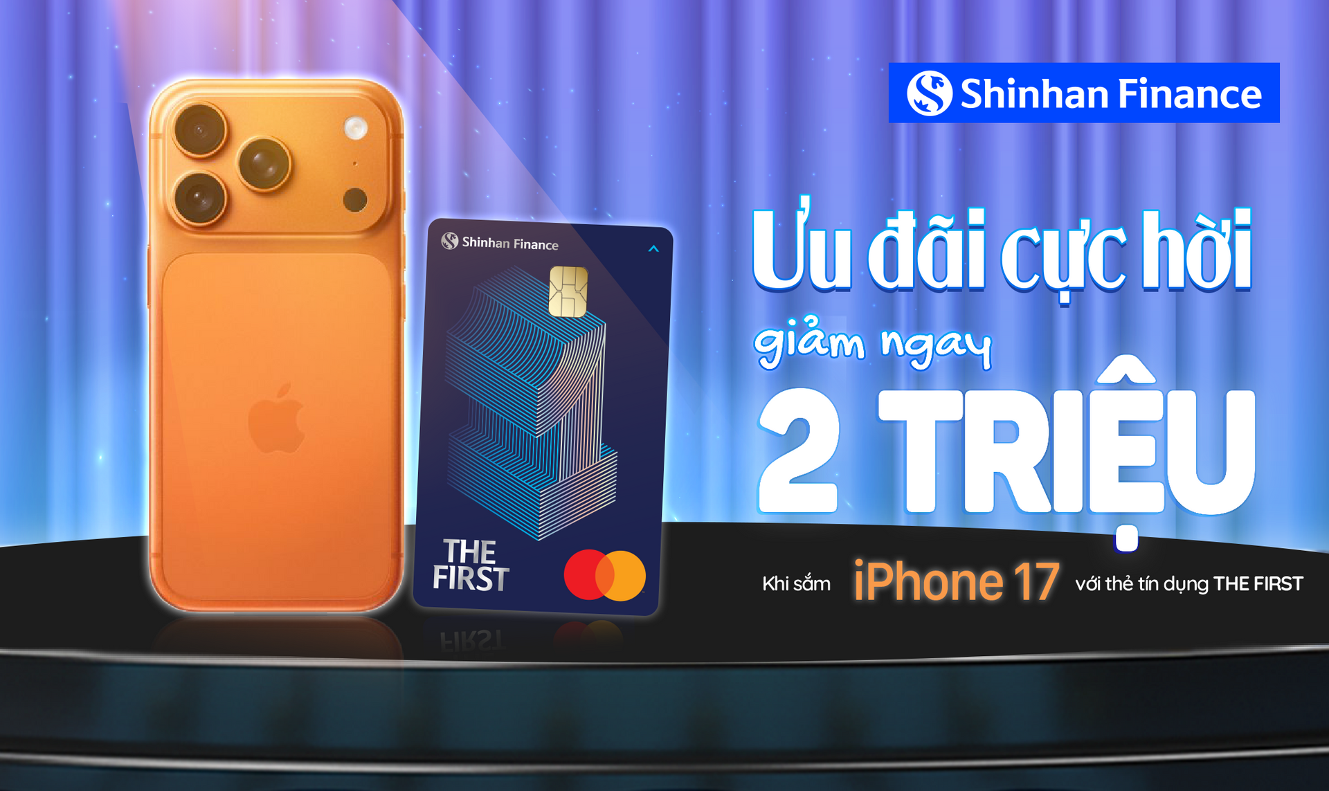 Song song với ưu đãi dành cho khách hàng vay tiêu dùng, Shinhan Finance còn dành tặng cơ hội hấp dẫn cho các chủ thẻ tín dụng THE FIRST. Nắm bắt sức nóng của iPhone 17 vừa ra mắt, Shinhan Finance kết hợp cùng các hệ thống phân phối ủy quyền lớn nhất Việt Nam gồm Thế Giới Di Động, TopZone, FPT Shop, CellphoneS và Hoàng Hà Mobile để mang đến ưu đãi trực tiếp. Khách hàng khi mua iPhone 17 chính hãng và thanh toán bằng thẻ THE FIRST sẽ được giảm ngay 2.000.000 đồng hoặc nhận phiếu mua hàng có giá trị tương đương. Số lượng ưu đãi có giới hạn theo từng đối tác và điều kiện áp dụng cụ thể được công bố chi tiết trên website của Shinhan Finance.