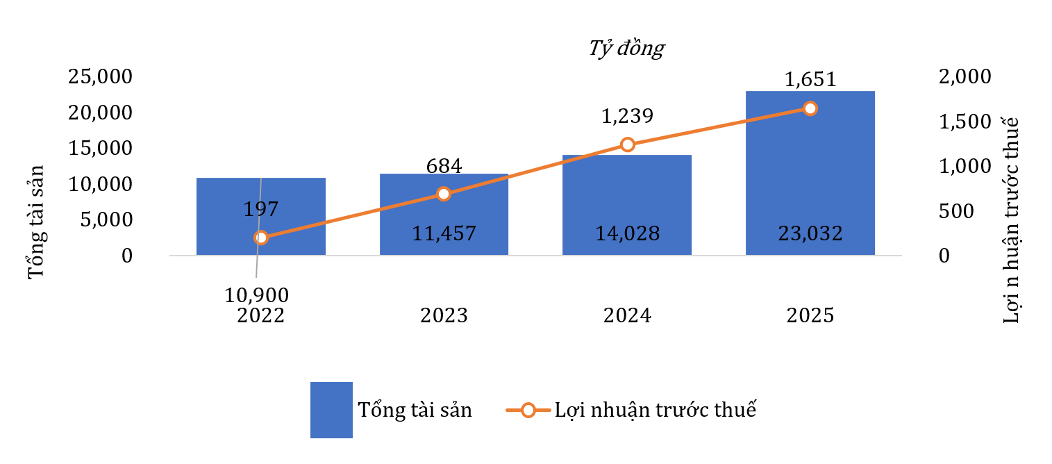 margin: 15px auto;" />Theo báo cáo tài chính hợp nhất, tại thời điểm 31/12/2025, quy mô tổng tài sản của SHS đạt 23.031,8 tỷ đồng, tăng 64,2% so với thời điểm cuối năm 2024. Mức tăng này chủ yếu đến từ việc mở rộng hoạt động cho vay ký quỹ và danh mục đầu tư tự doanh. Với kết quả đạt được, EPS năm 2025 của SHS đạt 1.495 đồng/cổ phiếu; ROAE và ROAA lần lượt ở mức 11,3% và 7,3%, cho thấy hiệu quả sử dụng vốn cải thiện so với các năm trước, dù vẫn ở mức trung bình so với nhóm công ty chứng khoán có quy mô tài sản tương đương.