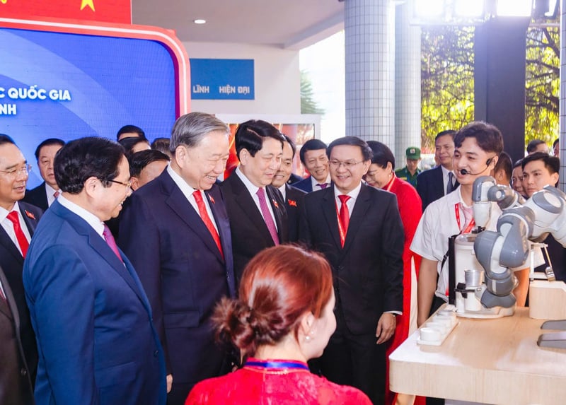 Tổng Bí thư Tô Lâm cùng các lãnh đạo, nguyên lãnh đạo Đảng, Nhà nước tham quan không gian triển lãm thiết bị công nghệ chiến lược tại Đại hội đại biểu Đảng bộ TP. Hồ Chí Minh. Trần Duy Khánh - sinh viên Khoa Công nghệ Điện IUH (áo trắng bên phải) vinh dự được trình bày sản phẩm công nghệ. Ảnh: IUH.