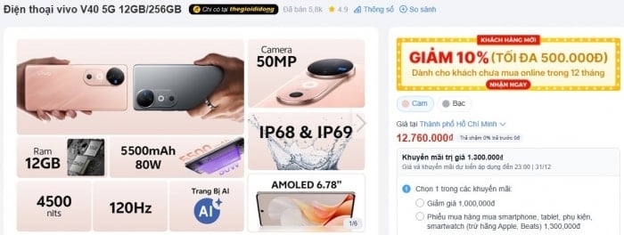 margin: 15px auto;" />Theo khảo sát thị trường, vivo V40 5G bản 12GB RAM và 256GB bộ nhớ trong đang được bán với giá khoảng 12,76 triệu đồng. So với Galaxy S25 cùng dung lượng lưu trữ, mức giá này rẻ hơn gần 5 triệu đồng nhưng những gì vivo V40 5G mang lại vẫn đủ sức khiến người dùng yêu thích nhiếp ảnh và thiết kế phải cân nhắc.