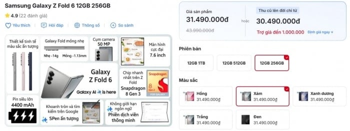 Trong khi Galaxy Z Fold7 vẫn giữ mức giá cao khiến nhiều người đắn đo thì Galaxy Z Fold6 lại trở thành lựa chọn "ngon – rẻ – xịn" hơn hẳn cho những ai muốn trải nghiệm điện thoại gập cao cấp của Samsung mà không phải bỏ ra số tiền quá lớn. Ngay đầu tháng 11, giá Galaxy Z Fold6 bản 12GB/256GB đã giảm về mức chỉ 31,49 triệu đồng, thấp hơn tới 13 triệu so với giá niêm yết. Điều đáng nói là mức giá này còn thấp hơn cả iPhone 17 Pro Max, trong khi khả năng đa nhiệm, gập mở linh hoạt và AI lại vượt trội hơn.
