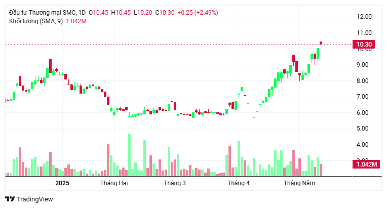 Trên thị trường, kết phiên giao dịch ngày 15/5/2025, giá cổ phiếu SMC đạt 10.500 VNĐ/cp, tăng gần 2% so với giá đóng cửa ngày 14/5/2025.