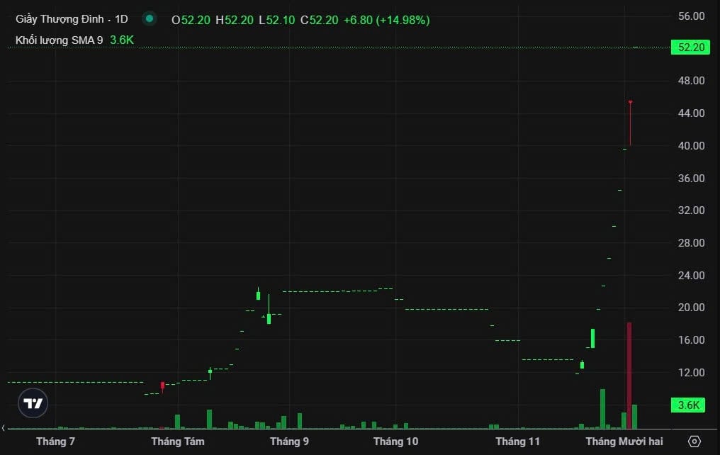Nổi bật trong số này là Công ty CP Giầy Thượng Đình (UPCoM: GTD). Ngay sau khi UBND TP. Hà Nội công bố kế hoạch đấu giá toàn bộ hơn 4,39 triệu cổ phiếu vào ngày 16/12, giá cổ phiếu GTD lập tức tăng trần và duy trì sắc tím đến cuối tháng 11. Bước sang tháng 12, sức nóng của mã này chưa hạ nhiệt khi tính đến ngày 2/12, GTD tiếp tục nối dài chuỗi tăng trần sang phiên thứ 10 liên tiếp, khối lượng khớp lệnh tăng vọt lên hơn 16.000.