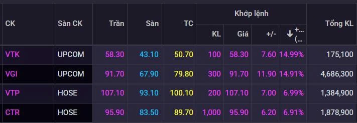 Phiên giao dịch cuối tuần chứng kiến diễn biến nổi bật của nhóm cổ phiếu “họ” Viettel khi cả bốn mã đang niêm yết và giao dịch trên thị trường gồm Viettel Global (VGI), Viettel Post (VTP), Viettel Construction (CTR) và Thiết kế Viettel (VTK) đồng loạt tăng kịch trần, thậm chí rơi vào trạng thái “trắng bên bán”. Diễn biến này nhanh chóng đưa nhóm Viettel trở thành tâm điểm của thị trường.