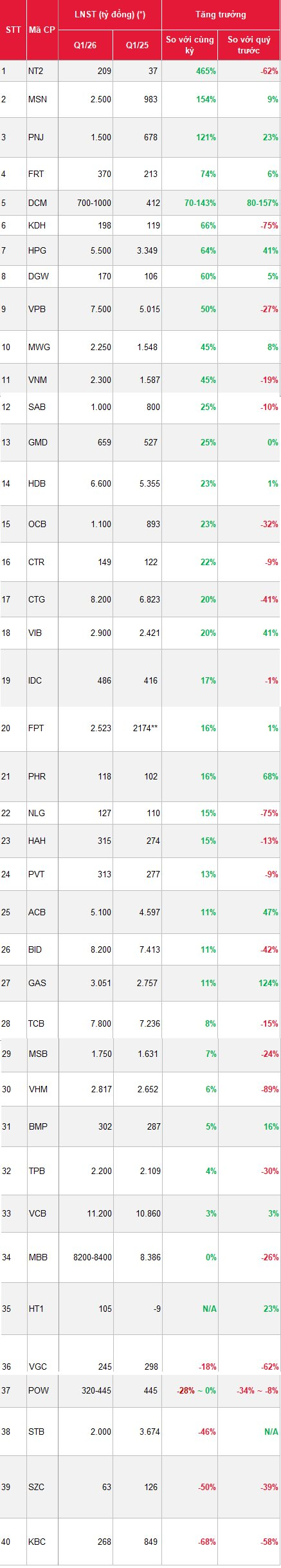 Cụ thể, các công ty có kỳ vọng tăng trưởng lợi nhuận dương bao gồm: NT2, MSN, PNJ, FRT, DCM, KDH, HPG, DGW, VPB, MWG, VNM, SAB, GMD, HDB, OCB, CTR, CTG, VIB, IDC, FPT, PHR, NLG, HAH, PVT, ACB, BID, GAS,...