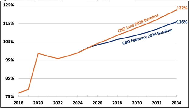 Về cân bằng nội, Mỹ đang phải đối mặt với gánh nặng nợ công kỷ lục. Theo Văn phòng Ngân sách Quốc hội của Mỹ (CBO), nợ Liên bang dự kiến vượt 122% GDP vào năm 2034 nếu không có biện pháp điều chỉnh (Biểu đồ 1). Chi phí lãi vay ngày càng chiếm tỉ trọng lớn trong ngân sách, trong khi nguồn thu thuế bị giới hạn bởi chính sách cắt giảm thuế doanh nghiệp.