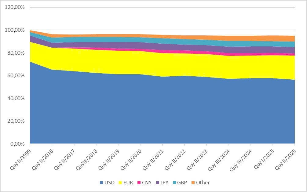 Theo cơ sở dữ liệu dự trữ ngoại hối chính thức của IMF (IMF COFER, 2025), cuối quý II/2025, USD chiếm 56,32% tổng dự trữ ngoại hối toàn cầu, Euro chiếm 21,13%, Yên Nhật 5,57%, Bảng Anh 4,83%, và RMB 2,12%. Dù tỉ trọng USD có xu hướng giảm nhẹ qua thời gian (so với 65% năm 2016), song chưa có đồng tiền nào tiến gần tới vị thế của nó (Biểu đồ 2).
