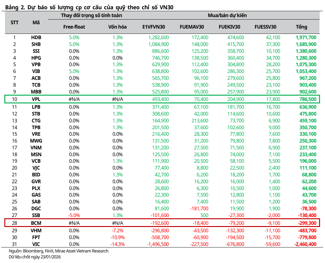 Tâm điểm của kỳ cơ cấu lần này nằm ở rổ VN30, khi cổ phiếu VPL chính thức được đưa vào thay thế cho BCM. Theo đánh giá của Mirae Asset Securities, nguyên nhân khiến BCM bị loại đến từ việc không đáp ứng yêu cầu về thanh khoản tối thiểu.