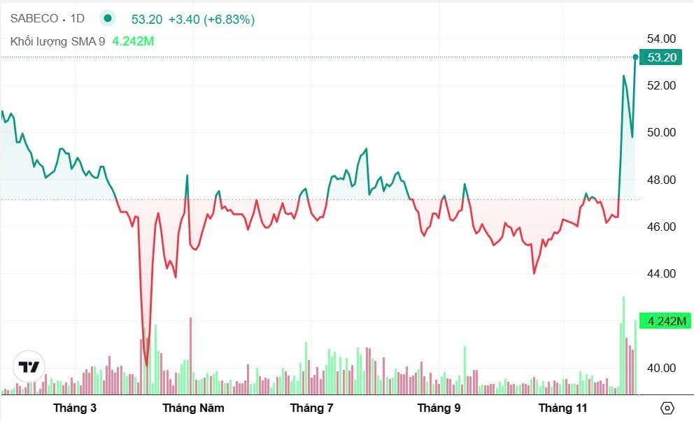 Phiên giao dịch đầu tuần ngày 8/12 chứng kiến cổ phiếu Tổng Công ty CP Bia – Rượu – Nước giải khát Sài Gòn (Sabeco, HOSE: SAB) trở thành một trong những tâm điểm đáng chú ý nhất của thị trường khi bật tăng hết biên độ, chốt phiên ở mức 53.200 đồng/cổ phiếu. Thanh khoản đạt hơn 3,4 triệu đơn vị và còn dưa mua ở mức giá trần gần 1 triệu đơn vị.