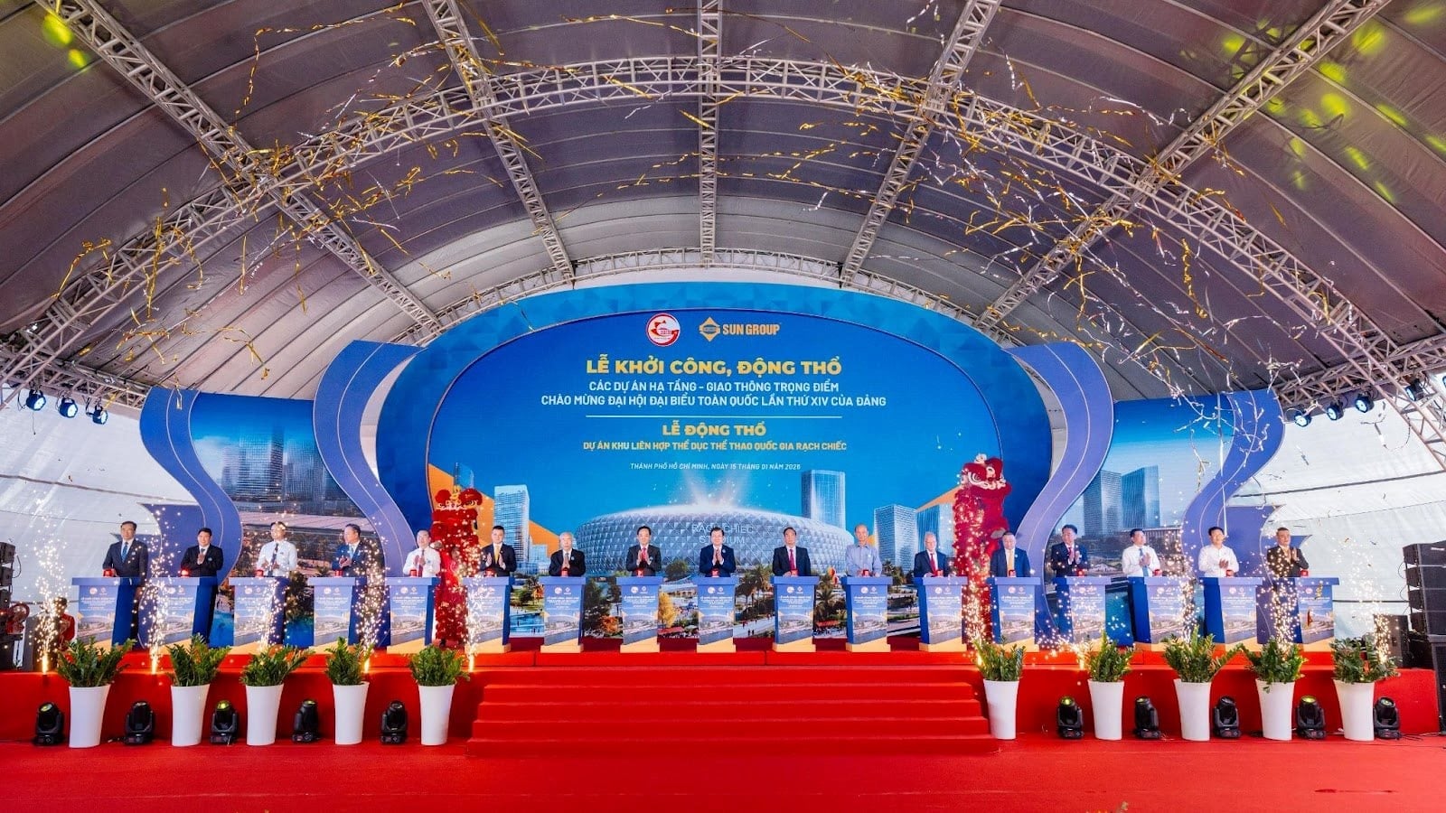 margin: 15px auto;" />Ngày 15/1, UBND TP. Hồ Chí Minh và Tập đoàn Sun Group đã tổ chức lễ động thổ dự án quần thể Khu liên hợp Thể dục Thể thao Quốc gia Rạch Chiếc. Đây là dự án có tổng mức đầu tư lớn nhất trong 4 dự án hạ tầng – giao thông trọng điểm (bên cạnh dự án tuyến Metro số 2 (Bến Thành – Tham Lương), Cầu Cần Giờ và cầu Phú Mỹ 2) được khởi công, động thổ ngày 15/1 tại TP. Hồ Chí Minh, nhằm chào mừng Đại hội đại biểu toàn quốc lần thứ XIV của Đảng.