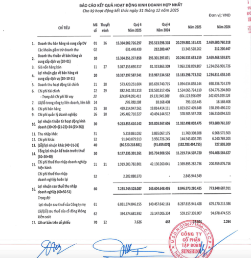 margin: 15px auto;" />Tập đoàn Sunshine (Mã chứng khoán: KSF) vừa công bố báo cáo tài chính hợp nhất quý IV/2025, cho thấy bức tranh tăng trưởng bứt phá trên mọi chỉ số sau quá trình tái cấu trúc toàn diện được kích hoạt từ năm 2024.