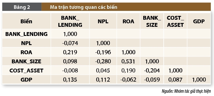 Bảng 2 trình bày ma trận tương quan của các biến nghiên cứu. Chỉ số ROA có mối tương quan dương yếu với BANK_LENDING, cho thấy các ngân hàng có lợi nhuận cao hơn có xu hướng thể hiện tăng trưởng cho vay cao hơn. Ngược lại, chỉ số ROA có mối tương quan âm yếu với NPL, hàm ý rằng các khoản nợ xấu cao hơn có liên quan đến lợi nhuận thấp hơn do tăng dự phòng rủi ro tín dụng. Tất cả các hệ số tương quan giữa các biến độc lập và biến kiểm soát đều dưới 0,7 cho thấy không có mối quan ngại về đa cộng tuyến trong mô hình hồi quy.