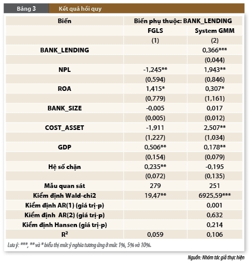 Bảng 3 trình bày kết quả hồi quy nghiên cứu tác động của nợ xấu đến hoạt động cho vay tại NHTM. Kết quả cho thấy, biến NPL có hệ số âm và có ý nghĩa thống kê trong cả hai mô hình hồi quy, khẳng định tác động tiêu cực của nợ xấu đến quy mô cho vay của NHTM. Biến ROA có tác động dương và ý nghĩa ở mức 1%, cho thấy hiệu quả hoạt động là yếu tố thúc đẩy cho vay. Trong khi đó, biến COST_ASSET chỉ có ý nghĩa trong mô hình System GMM và mang tác động tiêu cực, hàm ý rằng chi phí hoạt động cao có thể làm hạn chế khả năng mở rộng cho vay. Các biến BANK_SIZE và GDP không có ý nghĩa thống kê, cho thấy ảnh hưởng không rõ ràng đến hoạt động cho vay trong bối cảnh nghiên cứu. Các kiểm định Hansen và AR(2) cho thấy mô hình System GMM đạt yêu cầu về mặt thống kê, bảo đảm độ tin cậy của kết quả. Nhìn chung, kết quả nhấn mạnh tầm quan trọng của việc kiểm soát nợ xấu và nâng cao hiệu quả hoạt động nhằm thúc đẩy tăng trưởng cho vay trong ngân hàng.