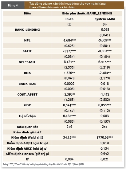 Để đánh giá thực nghiệm tác động của cấu trúc sở hữu đến mối quan hệ giữa nợ xấu và hoạt động cho vay, nghiên cứu bổ sung biến giả STATE trong mô hình nghiên cứu với giá trị 1 nếu ngân hàng có vốn nhà nước, giá trị 0 nếu là ngân hàng tư nhân. Trong mẫu nghiên cứu, ba ngân hàng được xác định là ngân hàng có vốn nhà nước gồm NHTM cổ phần Ngoại thương Việt Nam (Vietcombank), NHTM cổ phần Công thương Việt Nam (VietinBank), NHTM cổ phần Đầu tư và Phát triển Việt Nam (BIDV). Biến STATE được tương tác với biến NPL nhằm kiểm định liệu hình thức sở hữu có làm thay đổi tác động của nợ xấu đến hoạt động cho vay hay không? Kết quả được trình bày trong Bảng 4.