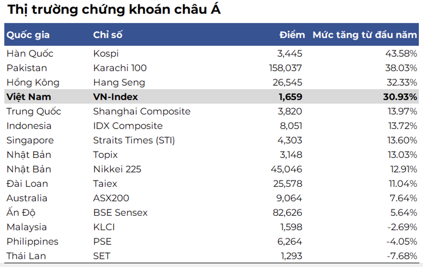 Không chỉ thăng hoa riêng lẻ, chứng khoán Việt Nam còn đi cùng nhịp với sự hồi phục của khu vực. Tính đến ngày 19/09, chỉ số MSCI châu Á – Thái Bình Dương tăng hơn 20% lên kỷ lục 220,71 điểm, vượt trội so với mức tăng của S&P 500. Trong khu vực, Việt Nam ghi nhận mức tăng mạnh thứ 4 châu Á, chỉ sau Hàn Quốc (+43,58%), Pakistan (+38,03%) và Hồng Kông (+32,33%). Ngược lại, một số thị trường lớn như Thái Lan, Philippines hay Malaysia lại ghi nhận mức giảm.