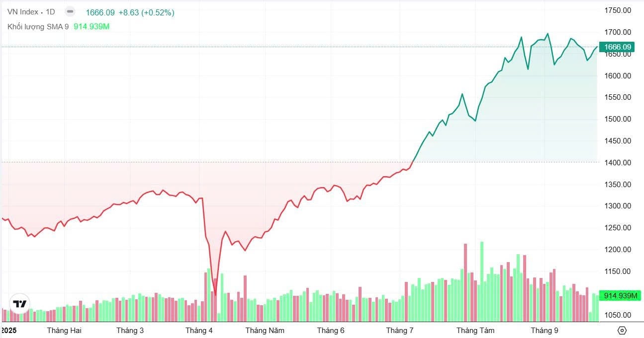 Điều ít ai ngờ, cú sốc chính sách lại mở ra một trong những đợt tăng giá nhanh và mạnh nhất trong lịch sử. Ngày 09/04 – thời điểm ông Trump bất ngờ thay đổi lập trường với chính sách thuế, VN-Index chạm đáy 1.080 điểm. Chỉ sau vài tháng, chỉ số này tăng liền mạch hơn 600 điểm, lập đỉnh gần 1.700 điểm trước khi hạ nhiệt về vùng 1.650 điểm vào ngày 19/09.