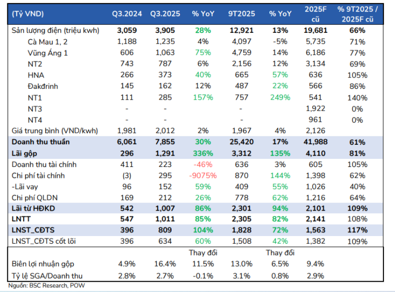 BSC dự báo năm 2025 POW sẽ ghi nhận 38.685 tỷ đồng doanh thu, tăng 28%; và 1.991 tỷ đồng lợi nhuận sau thuế, tăng 79% so với năm 2024. Bước sang 2026, doanh thu có thể đạt 62.691 tỷ đồng (+62%) và lợi nhuận sau thuế đạt 2.169 tỷ đồng (+9%). Đáng chú ý, lợi nhuận cốt lõi dự kiến tăng 23% nhờ biên gộp hồi phục, các nhà máy chạy ổn định và Qc tiếp tục được ưu tiên.