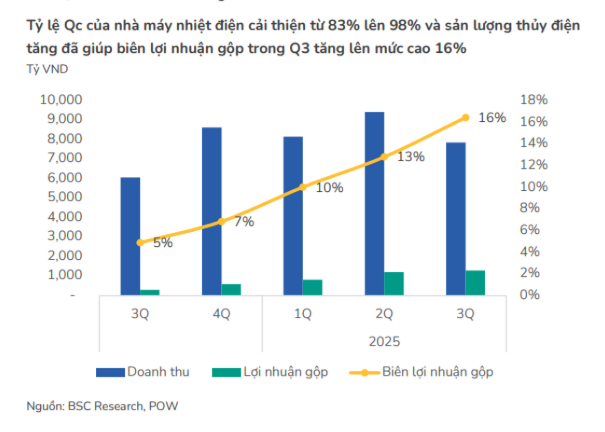Cũng nhờ tỷ lệ Qc tăng mạnh, biên lợi nhuận gộp của POW ghi nhận sự phục hồi đáng kể. Từ mức 6,6% năm 2024, biên gộp dự kiến tăng lên 11–12% trong 2025–2026, và riêng quý III/2025 đã đạt 16,4%, mức cao nhất trong vòng 20 quý.