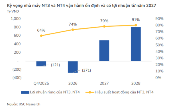 Hai nhà máy LNG lớn nhất cả nước đang được POW triển khai gồm Nhơn Trạch 3 và Nhơn Trạch 4 (NT3–NT4). BSC cho biết chi phí lỗ ban đầu của hai nhà máy này sẽ giảm đáng kể nhờ việc điều chỉnh tỷ lệ Qc tối thiểu từ 65% lên 75% trong giai đoạn 2026–2027, và lên 80% từ năm 2028. Điều này khiến mức lỗ dự kiến năm 2025 của NT3–NT4 giảm mạnh từ -400 tỷ xuống còn -121 tỷ đồng. Tổng lợi nhuận tích lũy giai đoạn 2025–2028 của hai dự án này dự kiến đạt 900 tỷ đồng, tăng gấp đôi so với dự báo trước đó.