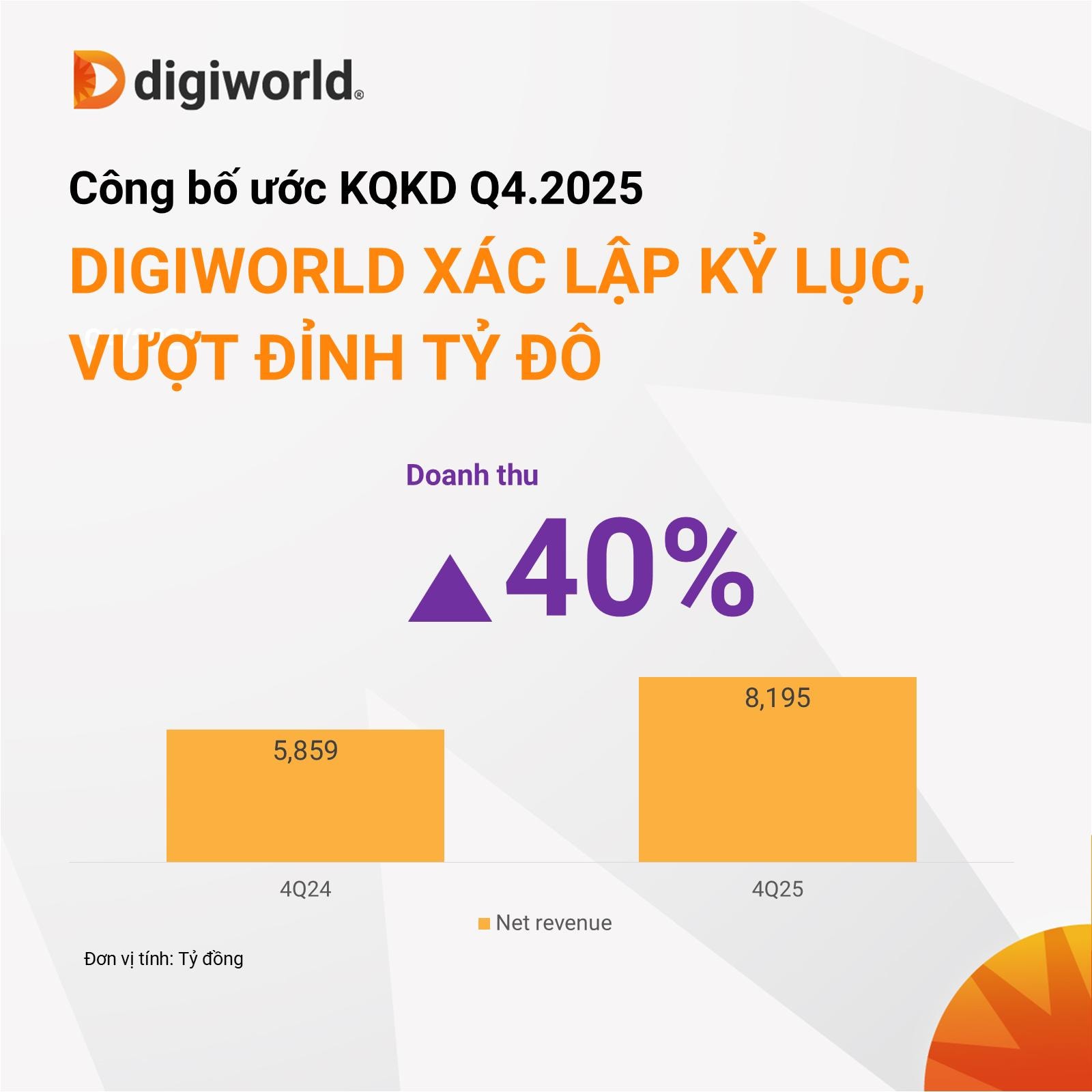 Trang trang Facebook chính thức, Công ty CP Thế Giới Số (Digiworld, HOSE: DGW) vừa công bố bức tranh kinh doanh quý IV và cả năm 2025 với điểm nhấn là mức doanh thu cao nhất kể từ khi thành lập. Đà tăng trưởng mạnh trong quý cuối năm đã giúp doanh nghiệp không chỉ vượt xa cùng kỳ mà còn hoàn thành vượt kế hoạch đề ra cho cả năm.