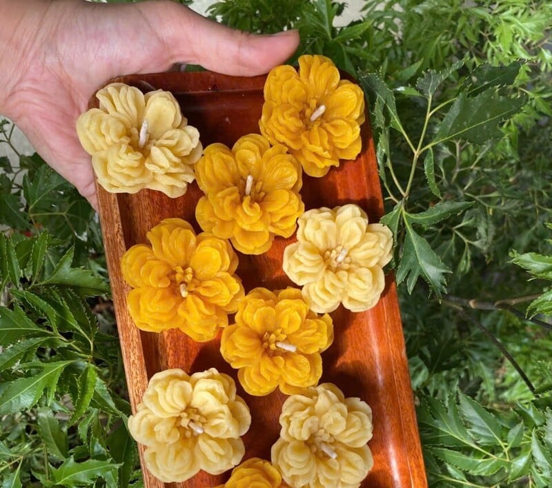 Theo chị Trà My, giá nến sáp ong trên thị trường rất đa dạng, tùy thuộc vào loại sáp, kích thước và thiết kế. Nến tealight nhỏ có giá từ 15.000 - 25.000 đồng/hộp 10 viên; nến trụ/cây nến dao động từ 50.000 - 300.000 đồng/cây tùy thời gian cháy; nến tạo hình hoa hồng, hoa sen dao động từ 80.000 -100.000 đồng/cái.
