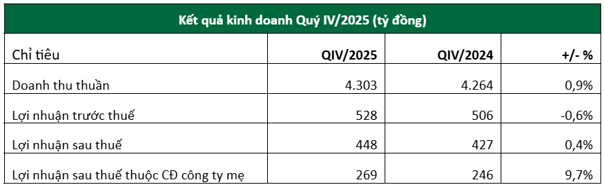 Tính riêng trong quý IV/2025, PAN ghi nhận doanh thu thuần 4.303 tỷ đồng và lợi nhuận trước thuế 528 tỷ đồng, tương đương cùng kỳ năm trước. Lợi nhuận sau thuế đạt 448 tỷ đồng, trong khi lợi nhuận sau thuế thuộc về cổ đông công ty mẹ đạt 269 tỷ đồng, tăng gần 10% so với quý IV/2024.